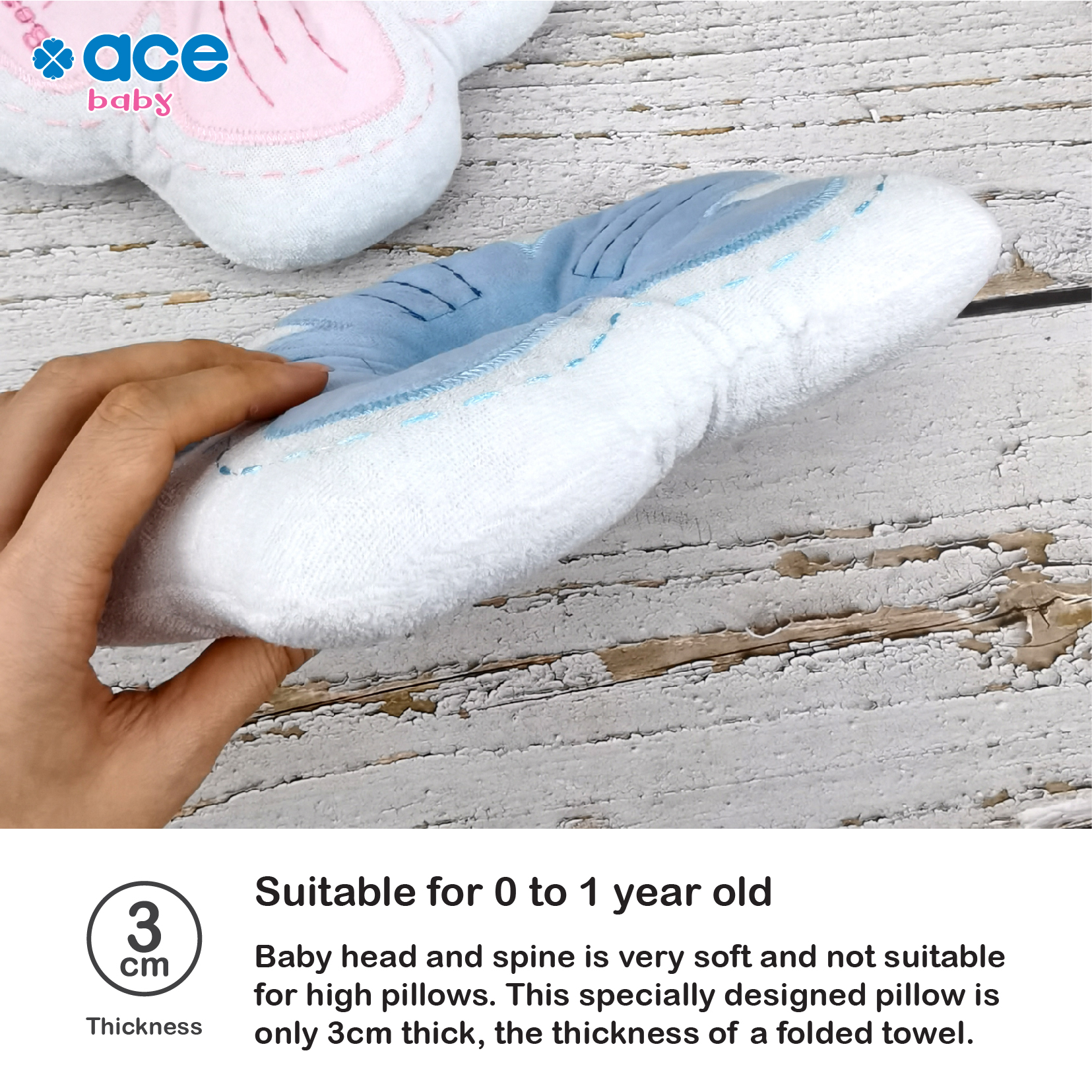 • Baby’s head and spine is very soft and not suitable for high pillow. This specially designed pillow is only 3cm thick, the thickness of a folded towel.