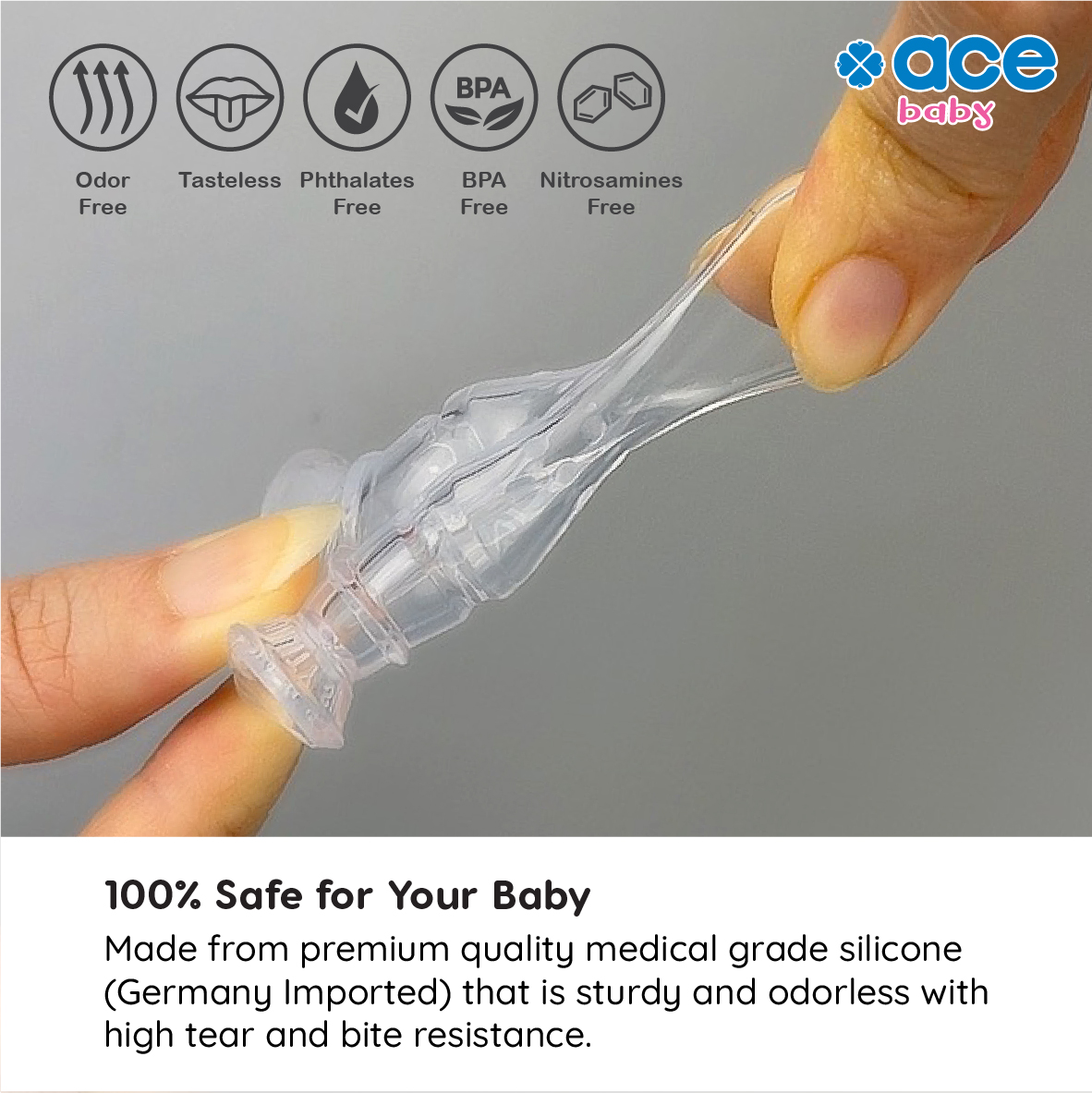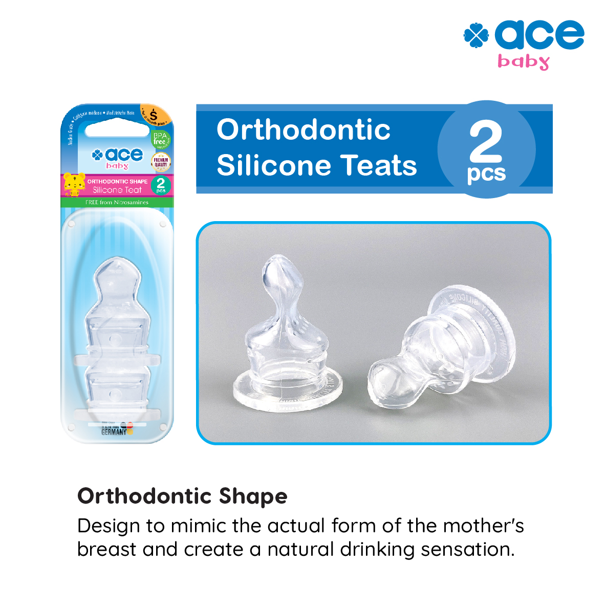 Ace Baby NEW IMPROVED Standard Neck Orthodontic Teats are made of medical grade premium silicone rubber imported from Germany that is soft yet sturdy and odourless with high tear and bite resistance. It is designed to mimic the actual form of the mother’s breast and create a natural drinking sensation. Orthodontic teats are loved by most parents as they help babies to promote healthy developments of palates and jaw muscles.