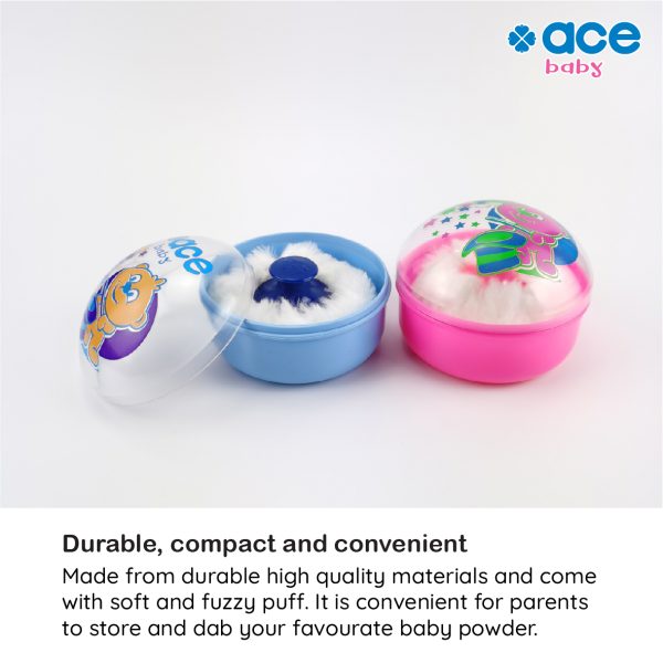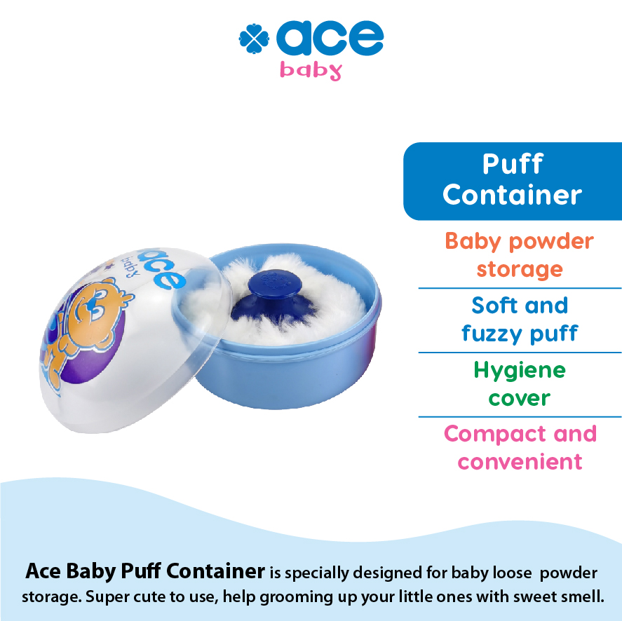 ACE BABY Powder Container With Puff is specially designed for babies, suitable for baby loose powder storage. Super cute to use, help grooming up your little ones with sweet smell.
